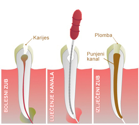 ENDODONCIJA – liječi patološki proces u zubnoj pulpi, koja inače zdravom zubu daje vitalnost, obskrbljujući ga sa živcima i krvnim žilama. Znači tu je zubna pulpa inficirana i ta infekcija se može proširiti na vrh korijene i stvoriti gnojni sadržaj koji uzrokuje otok i bol te razaranje kosti.